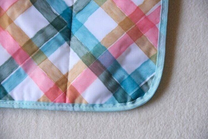 さらに、赤ちゃんにも安心な設計にしており、当たっても痛くないように、おむつ替えマットの四隅はラウンド形に縫製してあります。水彩絵の具で描いたようなナチュラルなタッチのチェック柄なので、ママもパパもおむつ替えが楽しくなりそう!